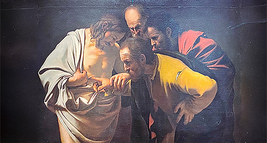 Ale Tomasz, jeden z Dwunastu, zwany Didymos, nie był razem z nimi, kiedy przyszedł Jezus. Inni więc uczniowie mówili do niego: „Widzieliśmy Pana!” Ale on rzekł do nich: „Jeżeli na rękach Jego nie zobaczę śladu gwoździ i nie włożę palca mego w miejsce gwoździ, i ręki mojej nie włożę w bok Jego, nie uwierzę”. (J, 20,24–25)